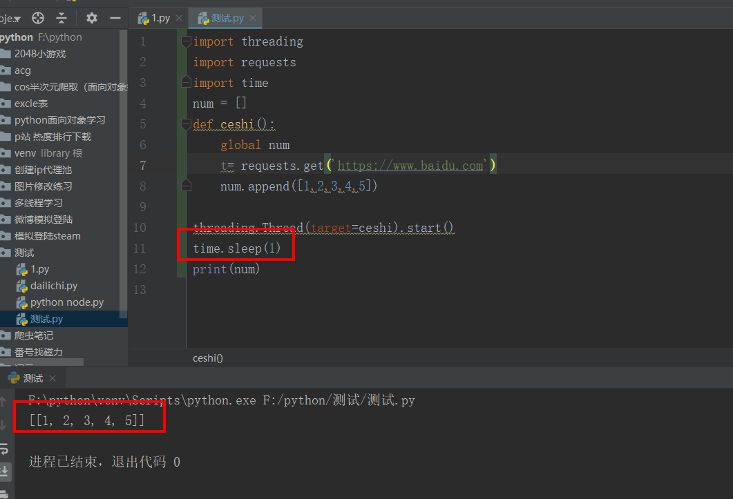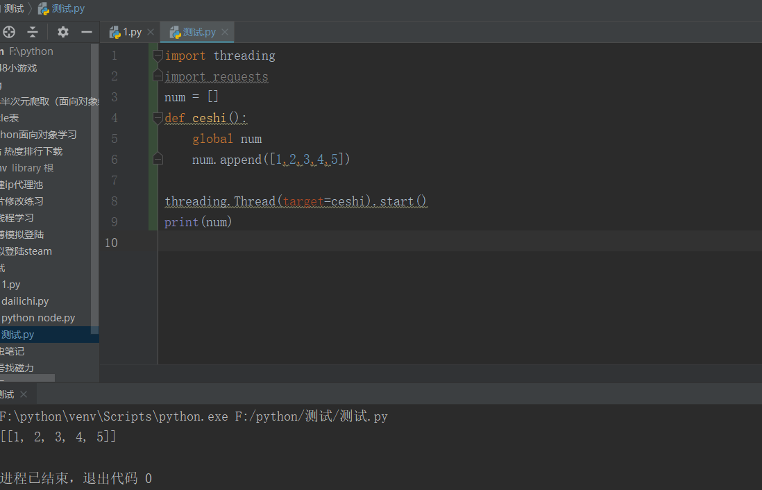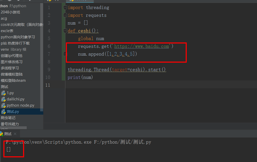 target后面是你用多线程跑的函数,args后面是你的函数的参数,注意了,这个里面是元组,就算是一个元素也要加逗号,这是基础了。 - 第二个是threading.Lock(),这是多线程的锁,当你不加锁的时候,你两个线程,操作同一个全局变量的话,会发生,资源竞争的情况,比如说,我定义一个全局资源num=0,现在你定义一个函数是加10000的,第二个函数也是加10000,如果不加锁的情况下,他们会竞争资源,num的值会发生错误的变化,比如变成10054,然后又变成10004,还会变小,如果加锁的情况,最终的结果是20000